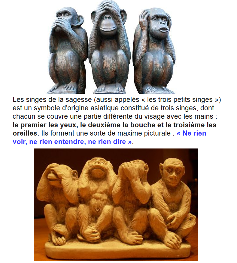 "Il y a ceux qui voient des choses et en parlent, mais n'écoutent pas ce que l'on leur dit…Il y a ceux qui ne voient rien, écoutent les autres et en parlent…Il y a ceux qui entendent et voient des choses, mais n'en parlent pas…« ne pas vouloir voir ce qui pourrait poser problème, ne rien vouloir dire de ce qu’on sait pour ne pas prendre de risque et ne pas vouloir entendre pour pouvoir faire « comme si on ne savait pas. »