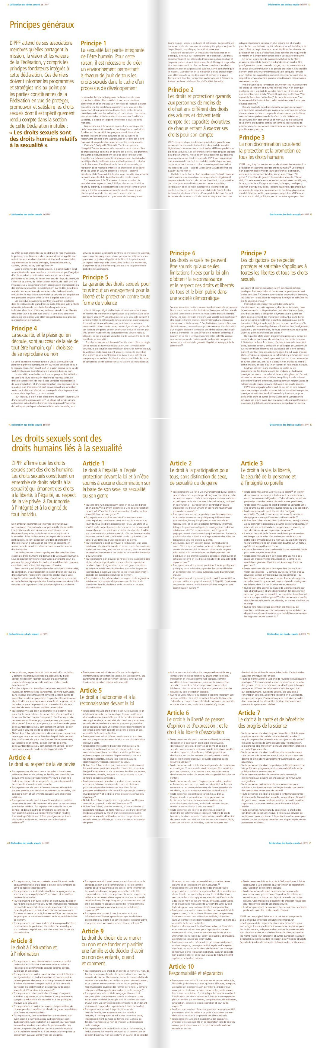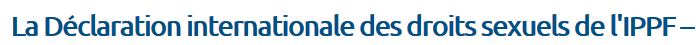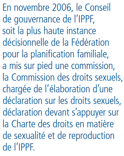 sensibilisation et de plaidoyer de l’IPPF. Les récents travaux de la région Hémisphère occidental ont aussi contribué à l’élaboration de la Déclaration. C’est en mai 2008, enfin, que la Déclaration des droits sexuels de l’IPPF a été présentée au Conseil de gouvernance de l’IPPF qui l’a adoptée.La Commission des droits sexuels a été constituée de volontaires et de membres du personnel des six régions de l’IPPF, ainsi que d’experts de renommée internationale en matière de santé et de droits sexuels et reproductifs.