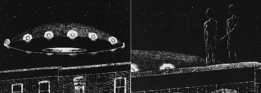 Elle se frotte les yeux, se pince pour voir si elle ne rêve pas. Elle doit pourtant se rendre à l'évidence : elle voit bien ce qu'elle voit. Et ce n'est pas tout. De cet appareil gris argent muni de phare à sa base, de cette soucoupe volante (car il n'y a plus de doute que c'en est une). Mme Malboeuf voit sortir deux êtres étranges de 6 pieds et 5 pouces de taille, vêtus d'un costume de couleur pâle, sans ceinture et très serré. Ces "êtres de l'espace" ne semblent pas peser plus de 25 livres chacun tant leur démarche est légère. Ils s'avancent vers le bord du toit, regardent dans la rue, puis vers le ciel. Ils réintègrent maintenant leur appareil et disparaissent comme ils sont venus. Le tout de l'atterrissage au décollage n'a pas duré une minute.