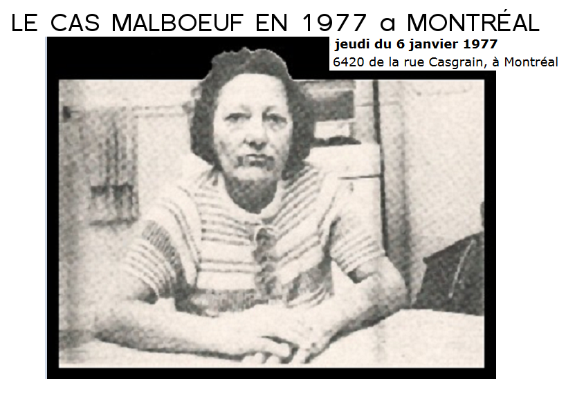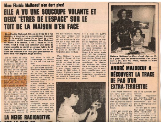 Mme Florida Malboeuf, 58 ans, du 6420 de la rue Casgrain, à Montréal est profondément traumatisée. On le serait à moins. En ce jeudi du 6 janvier 1977, plutôt insomniaque, Mme Malboeuf est assise à sa fenêtre. Il est 1 heure et 30 du matin. Tout à coup que voit-elle? Une sorte de grande assiette ou plutôt de grosse huitre de 15 pieds de diamètre en train d'atterrir sur le toit d'une des maisons d'en face (plus précisément au 6399, de la rue Casgrain, angle Burelle).