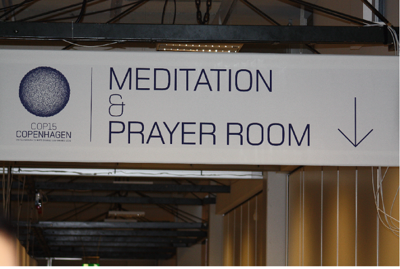 Avec la tension lors de la Conférence de Copenhague si épais vous pouvez le trancher avec une dalle de la fonte des glaces de l’Arctique, Glissé hors de la salle principale de bourdonnement, c’est une chambre blanche austère et sereine avec quelques plantes et un signe de vous dire d’enlever vos chaussures. Un espace silencieux, au milieu d’une demi-douzaine arbres en pot.