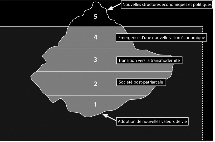 Nous distinguons 5 niveaux de changement, mais le changement apparaît comme un iceberg, en ce sens qu’il n’y a qu’un niveau qui soit visible, le politique, le Niveau 5. Nous observons une crise de crédibilité du politique à peu près partout. Et en même temps nous voyons apparaître de nouveaux paradigmes de non-violence entre États. Mais les quatre autres niveaux de changement plus profonds qui sont rarement évoqués dans les medias. Le niveau 4 est celui de la nouvelle économie post-capitaliste immatérielle qui est potentiellement une nouvelle économie non-violente, de don et de partage. Le niveau 3 est le passage vers la transmodernité où la conscience devient première par rapport à la matière, ce qui bouleverse l’approche scientifique classique. Le niveau 2 est la fin des valeurs patriarcales de commande, contrôle et conquête (CCC). Il nous faut y ajouter de nouvelles valeurs de reconnexion, de respect et de solidarité. Et enfin le niveau 1 où nous découvrons le moteur du changement lui-même. Nous changeons de civilisation parce que l’Humanité a déjà refusé la possibilité d’un suicide collectif, et que le subconscient collectif est en train de reprogrammer en chacun de nous, nos valeurs de mort en valeurs de vie. Cette transition dans nos profondeurs de nos valeurs de mort en valeurs de vie est le moteur puissant de la transformation en cours. à la fin du Moyen Âge, le basculement de civilisation vers la Renaissance est venu d’une nouvelle manière de concevoir la Terre et le ciel, proposée par Copernic. De même actuellement, le basculement de civilisation est en train de se faire autour d’une nouvelle définition de la conscience et de la matière. Nous sommes en train de quitter la métaphysique « M1 », qui dit que la matière existe et que la conscience en est une émanation. Et nous sommes déjà dans une nouvelle métaphysique « M3 » qui découvre que la conscience est première et permet l’émergence de la matière. Ce tremblement de terre conceptuel, transforme entièrement la démarche scientifique elle-même. Et la « nouvelle science » qui nait, correspond de plus en plus aux derniers développements de la physique quantique. Selon Harman cette nouvelle science transmoderne s’approche étrangement de la vision des Grandes Sagesses de l’Humanité. »L’humanité est-elle prête à accueillir une transformation de la conscience aussi radicale et profonde que celle qui lui permettrait de s’ouvrir à la splendeur du monde, à la manière d’un bourgeon qui explose au printemps pour faire apparaître la lumière de la fleur, prémisse de l’accomplissement du fruit ?