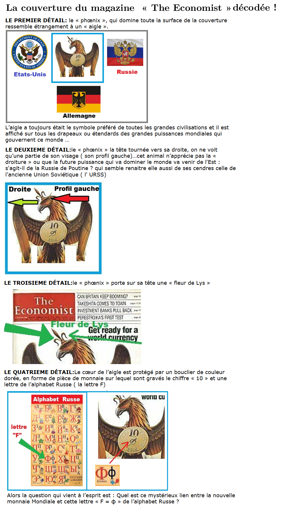 Voilà qui va faire cogiter, ceux qui aiment décrypter la une de « The Économist ».2019: les amateurs d’énigmes vont sûrement trouver de multiples codes cachés et autres messages subliminaux à décrypter.La couverture est à lire dans un miroir pour décrypter les commentaires.La Couverture de The Economist est un hommage à Léonard de Vinci, dont on fêtera le 500e anniversaire de la mort le 2 mai 2019.