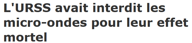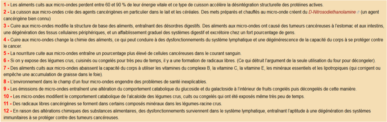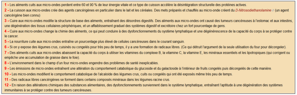 L'Humain continuent de manger des aliments morts tués par les fours à micro-ondes. Ils prennent un morceau parfaitement sain, chargé de vitamines et d'éléments nutritionnels, puis les irradient dans le micro-onde et détruisent presque tout son côté nutritif. Les humains sont les seuls animaux de la planète à détruire la valeur nutritionnelle de leur nourriture avant de la manger. Tous les autres animaux consomment la nourriture à son état naturel, non transformé, mais les humains courent en fait des risques pour rendre les aliments moins riches au plan nutritionnel avant leur consommation. Pas étonnant qu'ils soient les mammifères affligés de la plus mauvaise santé de la planète...En Russie, les fours à micro-ondes ont été interdits en 1976, à cause de leurs conséquences négatives sur la santé comme l'ont montré diverses études sur son utilisation. L'interdiction a été levée après la Perestroïka au début des années 90.Après la Deuxième Guerre Mondiale, les Russes ont aussi expérimenté avec des fours à micro-ondes. De 1957 jusqu'à récemment, leur recherche était effectuée principalement dans l'Institut de Technologie Radio à Klinsk en Biélorussie. Selon le chercheur étasunien William Kopp, qui a rassemblé beaucoup de résultats de la recherche russe et allemande - et a été apparemment poursuivi pour l'avoir fait -- les effets suivants ont été observés par les équipes russes autorisées :
