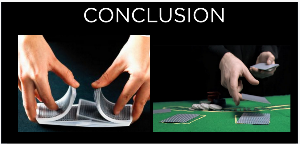 Celui qui distribue les cartes (donneur ou croupier) a pour rôle de mélanger les cartes avant chaque donne,de distribuer,les cartes aux joueur.Faites vos jeux - les jeux sont faits - Rien ne va plus = les 3 phrases rituelles dites par les croupiers dans les casinos car LES GRANDS MANIPULATEURS DE NOTRE MONDE joue avec nous parce que nous n'avons pas la conscience du jeu.« LE MONDE EST UN TERRAIN DE JEU avec le temps on finit par l’oublier. »«Le Monde règne en tant que jeu. Le jeu humain a une transparence cosmique.Il faut penser le mouvement total du Monde à partir du concept de jeu. »Il nous reste à prier pour que le château de cartes ne s'effondre pas complètement car L'expression « château de cartes » peut désigner une structure ou un argument qui s'appuie sur des fondations fausses ou fragiles, et qui s'effondrera parce qu'un détail essentiel a été omis... « Construire un château de cartes » renvoie à l'idée de projets fragiles et vains.Il faut être suffisamment lucide pour réaliser que nous sommes au bord d'un gigantesque bouleversement de l'ordre des choses. Manifestement inévitable, celui-ci va ressembler à un difficile accouchement pour notre planète et son humanité.Y aura-t-il besoin d'une césarienne ? Il faudrait d'abord savoir de quoi nous sommes prêts à enfanter, de quel nouveau monde nous sommes enceints. La question renvoie chacun de nous à son propre équilibre, à sa propre maturité, autrement dit à son niveau de conscience et aux valeurs réellement incarnées en lui. Le fait est que nous sommes tous confrontés à un choix. Sommes-nous partants pour concevoir dès à présent un futur d'espérance ? La Table est mise pour la Conférence du Mois du 20 Mai 2019 qui s'intitulera ''ÉSO 901, LES 9 COUP DE MINUIT ''.
