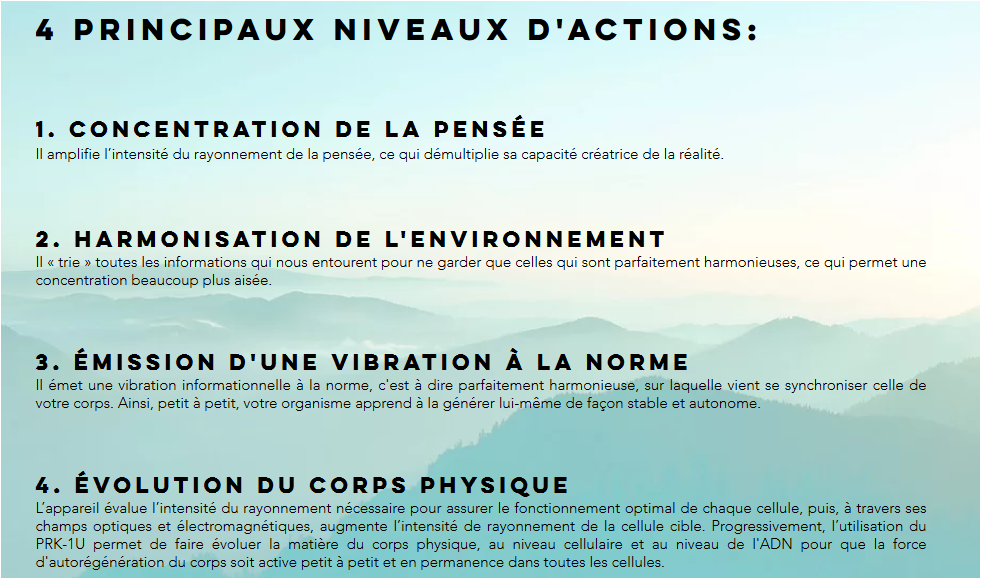 L’appareil a été conçu à l’image de l’organisme de l’homme, comme une conscience parfaitement structurée. Il vous reconnaît et vous soutient individuellement dans votre spécificité et votre unicité en fonction de vos besoins précis.Grigori Grabovoï a mis au point cet appareil après 20 ans de recherche et de développement, pour accompagner toutes les personnes qui chaque jour, essaient d’être une plus belle version d’elles-même.