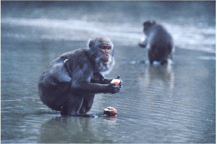 Cette innovation culturelle fut graduellement adoptée par différents singes devant les yeux des scientifiques. Entre 1952 et 1958, tous les jeunes singes apprirent à laver les patates douces remplies de sable pour les rendre plus agréables au goût. Seuls les singes adultes qui imitèrent leurs enfants apprirent cette amélioration sociale. Les autres singes adultes conservèrent leur habitude de manger des patates douces sales.