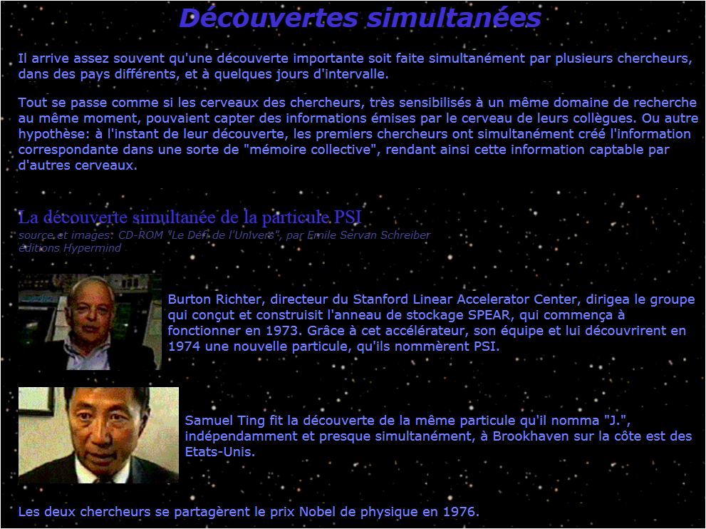 Nous retrouvons ce même principe dans les inventions. Nous avons constaté qu’une découverte réalisée dans un pays l’est aussi souvent dans un autre pays sans que les deux inventeurs se connaissent. Il s’agit là du même principe. Il se peut que le premier inventeur cherche pendant des décennies pour faire une découverte. Une fois cette découverte réalisée, le processus de pensée énergétique est achevé, la percée s’est faite et cette pensée est maintenant enregistrée à un niveau énergétique. Pour tous les autres chercheurs qui travaillent à un projet semblable, il sera dorénavant plus facile d’atteindre ce but puisque le premier inventeur, ou le centième singe, a fait cette percée.«Il est très intéressant de constater, écrivent-ils, que beaucoup d’inventions ont été faites à deux ou à plusieurs reprises par différents inventeurs, chacun travaillant sans avoir connaissance des recherches de l’autre. Il est bien connu, par exemple, que le calcul infinitésimal a été inventé par Newton et par Leibniz. La théorie de la sélection naturelle a été développée de manière quasi identique par Wallace et Darwin. D’aucuns affirment que les frères Wright et Samuel Langley ont inventé l’avion. Et nous savons tous que le téléphone a été inventé à la fois par Gray et par Bell.»Le moteur à réaction a été inventé simultanément par le Britannique Frank Whittel et l'Allemand Hans Von Ohain en 1936, sans que les deux ne se connaissent ou connaissent les travaux de l'autre ! Ils eurent simplement la même idée en même temps, et les deux ingénieurs se rencontrèrent par la suite et finirent par devenir amis.-«A croire que certaines idées flottent dans l’air au-dessus de l’atmosphère et que ceux qui ont la capacité de les y pêcher uniformisent l’intelligence planétaire de l’espèce», dit à cet égard Bernard Weber dans Le livre secret des fourmis.L'expression "Les grands esprits se rencontrent" prend tout son sens.