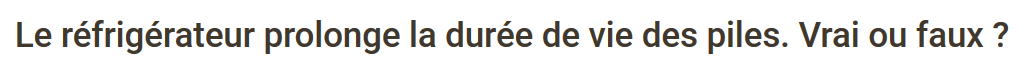 Conservez toujours les piles à température ambiante et au sec !Les piles alcalines stockées à « température ambiante » s’auto déchargent à un taux de moins de deux pour cent par an. Donc, normalement, le stockage dans un réfrigérateur ou un congélateur ne fera que contribuer à maintenir leur charge pour une quantité infime. Il n’est donc pas nécessaire de les refroidir. Cependant, si les piles alcalines sont stockées à des températures trop élevées, elles vont commencer à perdre de leur capacité beaucoup plus rapidement. À 29 degrés, elles perdent environ 5% par an, mais à 37 degrés, elles perdent 25% par an. Donc, si vous vivez dans un climat très chaud ou que vous stockez vos batteries dans un endroit très chaud, il peut être intéressant pour vous de stocker vos piles alcalines dans un réfrigérateur.Les piles NiMH et NiCd s’auto déchargent à un rythme beaucoup plus rapide que les piles alcalines. En fait, à « température ambiante » (environ 21 degrés) les piles NiMH et NiCD s’auto déchargent de quelques pour cent par jour. Les stocker à des températures inférieures va ralentir leur taux de décharge spontanée de façon spectaculaire. Les piles NiMH stockées dans un congélateur conservent plus de 90% de leur charge pour un mois complet. Donc, il peut être judicieux de les stocker dans un congélateur. Si vous le faites, il est préférable de les ramener à température ambiante avant de les utiliser. Même si vous n’avez pas congelé vos piles NiMH après les avoir chargées, vous devez les stocker dans un endroit frais pour minimiser leur autodécharge.