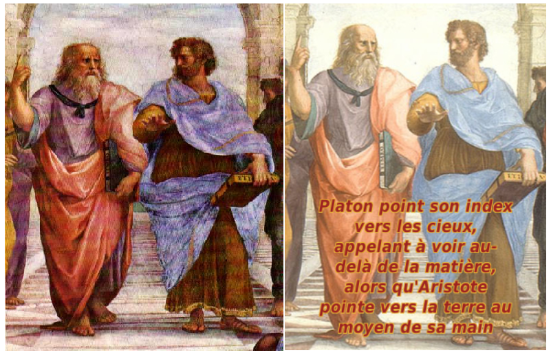 Dans son tableau célèbre, L'école d'Athènes, le peintre Raphaël met en scène les savants philosophes de l'Antiquité. Sur ce détail on peut voir Platon à gauche et Aristote à droite. Platon, avec le visage de Léonard de Vinci, montre le ciel avec son INDEX,indiquant par là que la connaissance prend ses racines dans le monde des idées (le Timée est visible dans sa main gauche). À l'inverse, Aristote montre le sol et donc l'expérience comme source de la connaissance. Il tient son ouvrage sur l'éthique dans sa main gauche.