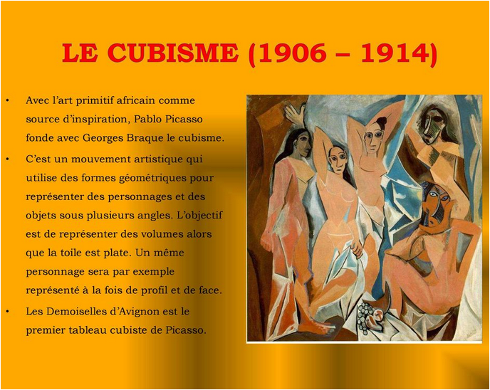 Le terme cubisme provient de la réflexion d'Henri Matisse-Si l’on veut donner le sens du mot "cubisme" tel qu’il serait présenté dans un dictionnaire, on pourrait dire que c’est une école d’art qui se proposait de représenter les objets décomposés en éléments géométriques simples.