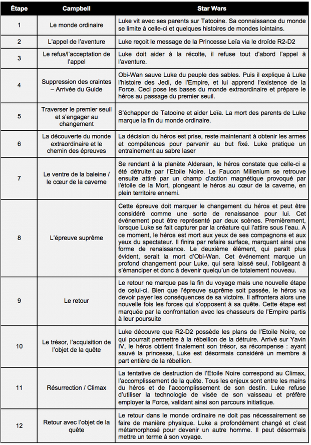 Dans son livre Theories of Mythology, l'helléniste Eric Csapo mentionne brièvement les travaux de Campbell dans la section « Psychanalyse » et les définit comme « une approche jungienne à la base, quoique éclectique, du mythe ». Les travaux de Campbell sont influencés par la psychologie analytique fondée par Jung (lui-même ancien collaborateur de Sigmund Freud) dans la première moitié du XXe siècle.Luke Skywalker vit une vie de fermier sur Tatooine. Soudain, deux droïdes lui montrent l’appel à l’aide de la princesse Leïa et il rencontre Obi-Wann, qui lui parle des Jedi et des Sith, puis plus tard commence une formation de Jedi. Luke refuse de partir : il est trop attaché à son oncle et à sa tante. Mais quand ces derniers sont tués, il ne peut revenir en arrière et accepte la quête : délivrer la princesse Leïa, rejoindre la rébellion et détruire l’Etoile Noire. Il rencontre des alliés, comme Han Solo et Chewbacca, et des ennemis, dirigés par Darth Vador. Lors de l’ultime épreuve, Luke fait appel aux enseignements d’Obi-Wann et détruit l’Etoile Noire. L’aventure terminée, Luke est honoré par les rebelles.