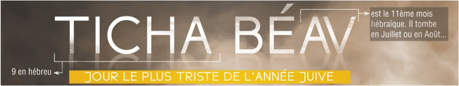Tisha Beav-Le neuvième jour du mois d’av (hébreu : תשעה באב tish°a bè'av) est la date correspondant selon la tradition rabbinique au « jeûne du cinquième mois » évoqué dans le Livre de Zacharie. C'est le plus strict des quatre jeûnes d'institution prophétique.Institué par les prophètes pour pleurer la chute du premier Temple de Jérusalem, il commémore ensuite une série de calamités nationales pour le peuple judéen puis juif, dont: