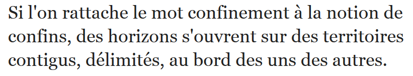 Considérons un instant ce mot-là : fin, pour tenter d’apprivoiser notre confinement. Le sens propre du mot fin, donc, est spatial. Ce n’est qu’au sens figuré qu’il s’est mis à désigner le terme d’un processus – le moment où il cesse. De lui nous vient bien sûr finir – qui signifiait d’abord «délimiter» – et définir. Et puis ces confins, dont le sens maintenant s’éclaire : ce sont les «territoires contigus», ceux dont les limites (finis) sont communes (cum). De là confiner : s’approcher de ces limites partagées. Ainsi le confinement a bien, euh… finalement, quelque chose à voir avec la communauté. Non, ce n’était pas trop beau pour être vrai !