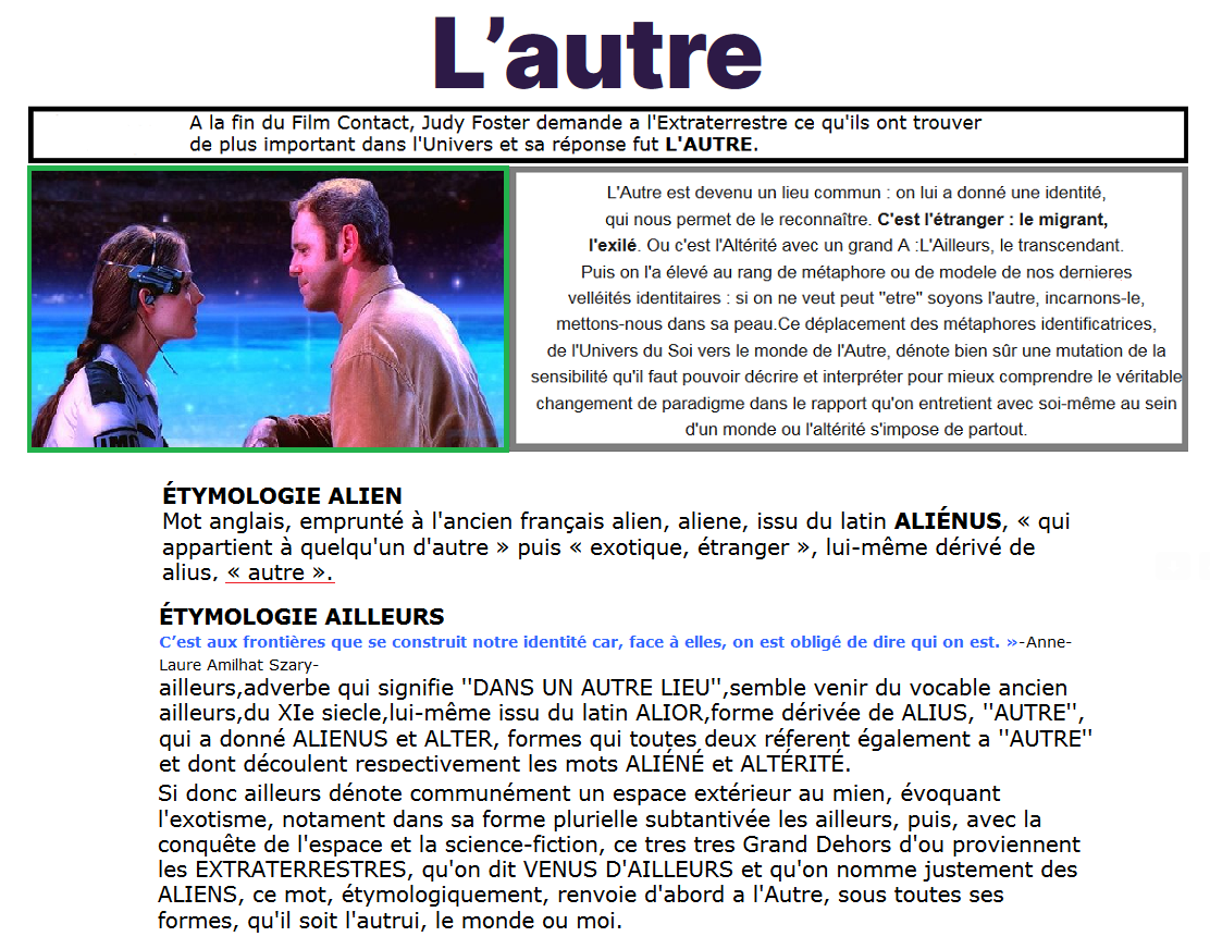 l'antonyme d' « altérité » est « identité ».ou la reconnaissance de l’autre dans sa différence, aussi bien culturelle que religieuse.C'est une recherche sur la relation avec autrui.