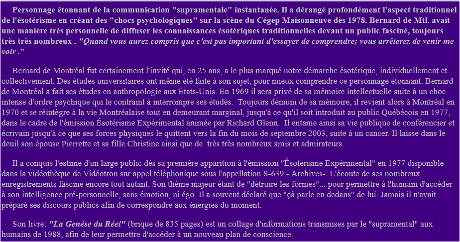 Le 26 juillet 1939, Bernard de Montréal naît à Montréal, Canada, de parents canadiens-français et canadiens-anglais. Il poursuit des études au Collège Sainte-Croix, un externat classique catholique. Il entreprend ensuite des études en anthropologie à l’Université d’Albuquerque, au Nouveau-Mexique. L’auteur connaît alors une expérience qui le transforme et qui informera son exploration de l’esprit humain à travers la télépsychie. Commence alors l’œuvre d’une vie, reposant sur un mode de canalisation consciente qui produira une pensée portant sur divers sujets, dont la psychologie paranormale et la métaphysique.À titre de canal, Bernard de Montréal eut recours à l’écriture automatique et à une forme de « canalisation mentale », selon ses termes, afin de capter et communiquer l’information d’un dialogue interne. Ces modes d’expression distincts caractérisent la tonalité de ses conférences et de son enseignement. Il entame une série de conférences dès Conférences avec Richard Glenn(de 1977 à 1984 et en 1988 au lancement de son Livre ''GENÈSE DU RÉEL''),Conférences avec François Payotte (1985-1989),Conférences avec Daniel Ménard (1990-1996)-Bernard de Montréal poursuivra ses Conférences jusqu’à son décès en 2003.Bernard de Montréal est l’auteur de trois œuvres fondamentales intitulées La Genèse du Réel (1988), Dialogue avec L’invisible (1997) et Beyond the Mind (Par-delà le Mental)(1998).