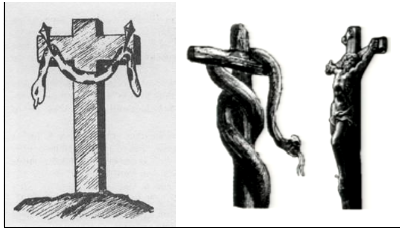 "Et comme Moïse éleva le serpent dans le désert,il faut de même que le FILS DE L'HOMME soit élevé afin que tout homme qui croit en lui ait la vie éternelle."Les pères de l'Église ont vu dans le Christ, "Serpens, Christus, proper sapientiam" le serpent crucifié en rappel du serpent d'Airain élevé par Moïse sur l'Étendard pour la guérison des Hébreux mordus par les Brûlants et Jésus est comparé au serpent dans le désert.