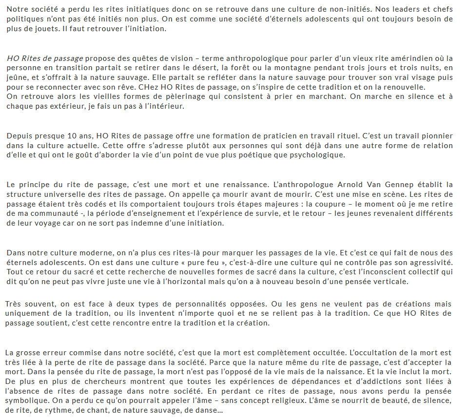 Fondée en 1990 par Paule Lebrun et Gordon Robertson, HO Rites de Passage est une école québécoise de rites de passage qui se spécialise dans ce que les anciens nommaient le «soul's work» (travail de l'âme)...Ho, Paule Lebrun en porte l'âme et la vision. Pionnière au Québec de ce qu'on appelle les changements de paradigme, voyageuse de long cours, auteure et journaliste de grand reportage, cette perpétuelle chercheuse s'intéresse depuis toujours aux cultures autochtones et orientales. Fascinée par la diversité et la puissance des rituels de ces traditions millénaires, elle les a analysés en profondeur pour en saisir l'essence et elle s'est donnée pour mission de les réintroduire peu à peu dans la culture occidentale.Elle a offert des conférences, animer des ateliers et guide des voyages où elle a communiqué et partagé sa passion. Elle est décédé le 13 novembre 2017, à l'âge de 72 ans.