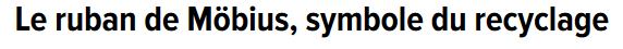 Une version schématisée du ruban de Möbius est utilisée comme logo des matières recyclables depuis le premier Jour de la Terre en 1970. La boucle de Möbius indique qu'un produit peut être recyclé, ou qu'il a été fabriqué à partir de matériaux recyclés. Il s'agit en fait d'un ruban à trois demi-tours.