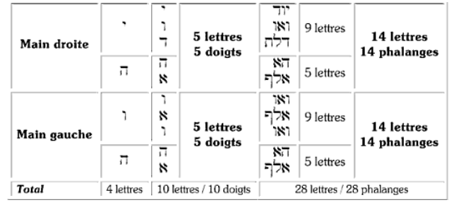 [/color]On retrouve dans sa valeur numérique (14); le nombre de phalanges qui compose notre main. Pouce 2 phalanges + Index : 3 phalanges + Majeur: 3 phalanges + Annulaire: 3 phalanges + Auriculaire: 3 phalanges = 14 phalanges.
