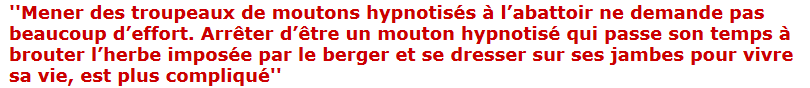 Le mouton plie l’échine et se rend… sauf s’il se souvient que ce cauchemar est une illusion, une pièce de théâtre dans laquelle il joue un rôle de mouton, VICTIME impuissante des autorités extérieures. Plutôt que de maudire le berger et vouloir le changer, il peut décider de laisser tomber son personnage, quitter la scène et retrouver son identité véritable.nous sommes devenus dociles, prévisibles : aujourd’hui nos maîtres ne sont plus tyrans, ils se présentent comme de bienfaisants bergers. Nous sommes conduits comme des moutons paisibles vers de verts paturages. Bien sûr ils parlent encore de sécurité, le chien du berger peut encore être laché et nous courir après, nous mordre même, mais enfin c’est pour notre bien, et nous nous en sommes convaincus ! Il nous faut un berger, avec un chien : nous ne supportons pas encore qu’un simple mouton commande. Avec un bon berger (il est bon par définition), nous suivons le troupeau sans hésiter, et nous voilà débarrasés de notre libre-arbitre, tant nous sommes assurés que le berger connaît le bon chemin et sait mieux que nous-mêmes où nous devons aller.Immergés dans le troupeau, nous nous rendons incapables de penser avec recul.