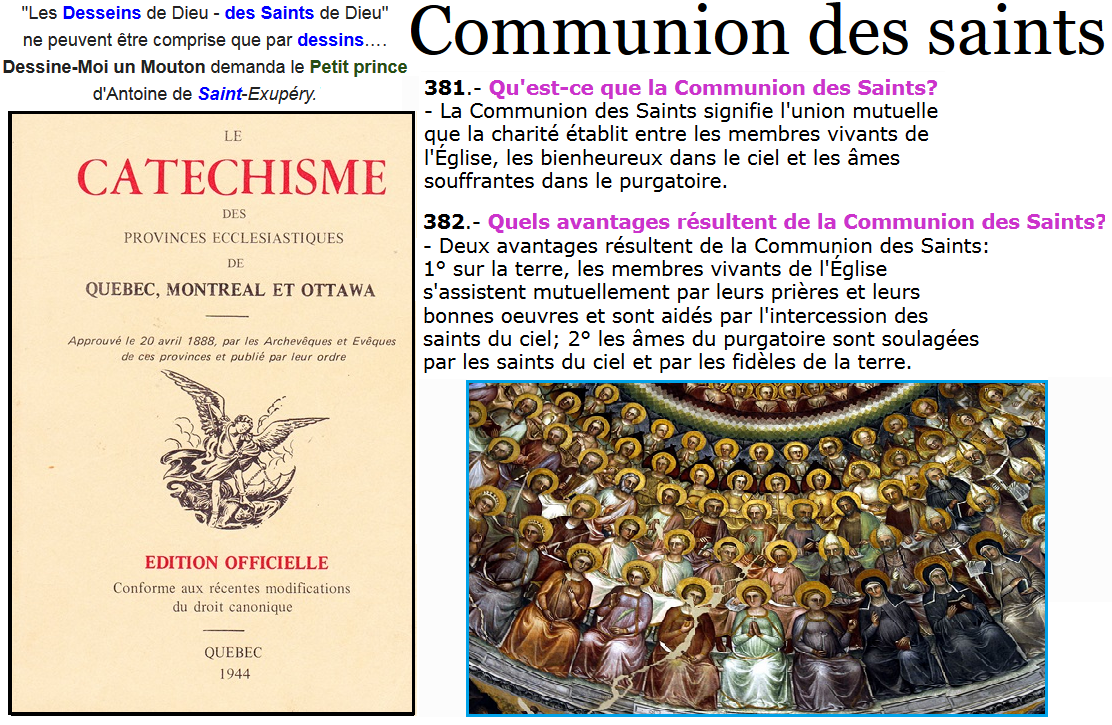 Par communion des saints, on entend cette solidarité spirituelle qui unit tous les fidèles de la Terre, les âmes du purgatoire et les saints du Ciel – les anges aussi – dans un même Corps ayant pour tête le Christ. Ces êtres se communiquent les biens spirituels dans un échange permanent. « Puisque tous les croyants forment un seul corps, le bien des uns est communiqué aux autres » (saint Thomas d’Aquin).En fait la communion des saints c’est une sorte de solidarité entre les vivants et les morts, «c'est une responsabilité mutuelle : je peux aider les défunts que j'aime en priant pour eux, et je leur demande de m'aider en me recommandant à leur prière ».