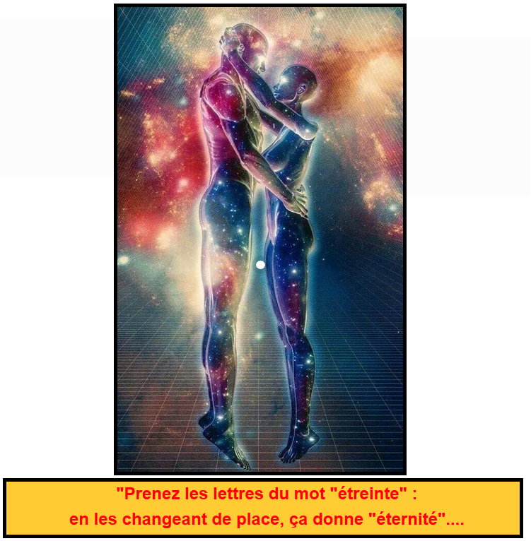 Une telle communion n'a pas encore eu lieu, mais le Nouvel ère la verra.L'histoire de la chambre haute dans laquelle se rencontrèrent les disciples et où ils arrivèrent à une véritable reconnaissance du Christ Ressuscité(L'ANAGRAMME DU MOT RESURRECTION donne le Mot RECONSTRUIRE). Ils eurent(Les Apôtres), un bref aperçu prophétique de ce que serait la merveille de l'Ère du Verseau.Nous avons ainsi le tableau de l'humanité future...sachons que nous avons Eté, nous Sommes et Serons ; c'est juste une question de "ME"-"MOI"-RE ou un retour du Moi sur Soi, une re-flexion de l'homme sur l'esprit céleste qu'il fut - en tant qu'ange - et qui fut DÉMEMBRÉ (car "coupé" en 2), d'où le verbe anglais REMEMBER, se souvenir, RE-MEMBRER...L'homme crée ainsi son propre enfer, surtout en cet âge du fer où l'homme cherche désespérément à "faire" avant que d'être. Contresens absolu qui demande à être rectifié.