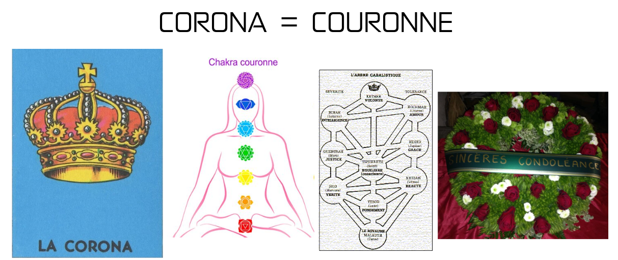 Le CORONAVIRUS est porteur du nom de la couronne du 7ème chakra, appelé le chakra CORONAL.« Corona » est associée à la couronne. Celle-ci fait la jonction entre la Terre et le Ciel. La Tradition de la Kabbale parle de la Séphira « Kether », associée au chakra coronal. Ce sont des points de relais, de contact entre le corps et l’esprit, entre notre être incarné et l’Esprit … divin.Ce lien divino-humain serait donc parasité par un « virus » reflet d’une rupture de l’Alliance avec la Transcendance. Il témoignerait d’une désertion de la foi, d’un désinvestissement de la relation à l’Esprit. Or, si le souffle de l’Esprit fait défaut … c’est la mort. Synchronicité ? Ce virus s’attaque aux voies respiratoires …La couronne peut également désigner un objet décoratif ayant la forme d'une couronne, servant par exemple à exprimer le regret d'une personne défunte (couronne funéraire) ...