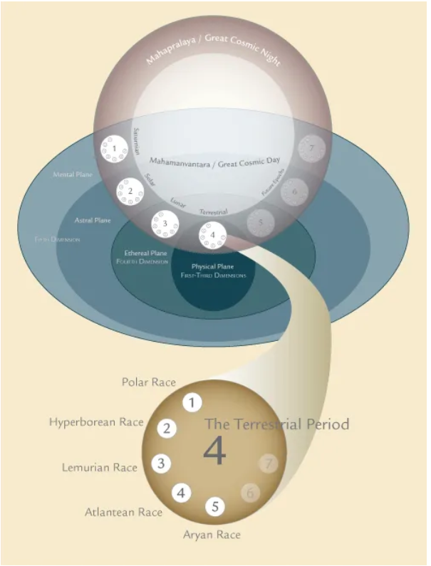 L'Humanité est actuellement, ésotériquement parlant (mais peut-être pas occultement), au stade de la Cinquième Race-Racine et de sa Cinquième Sous-Race.Dans la Théosophie, il existe 7 Races-Racines ou Races-Mères :