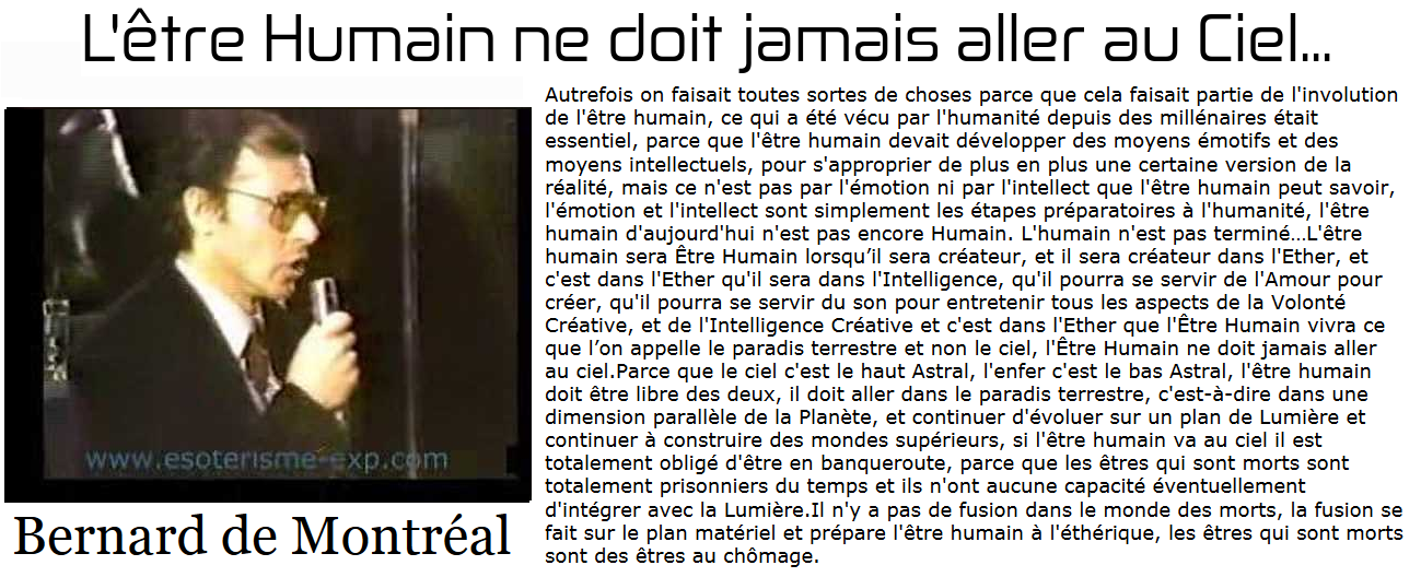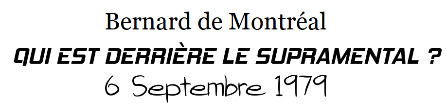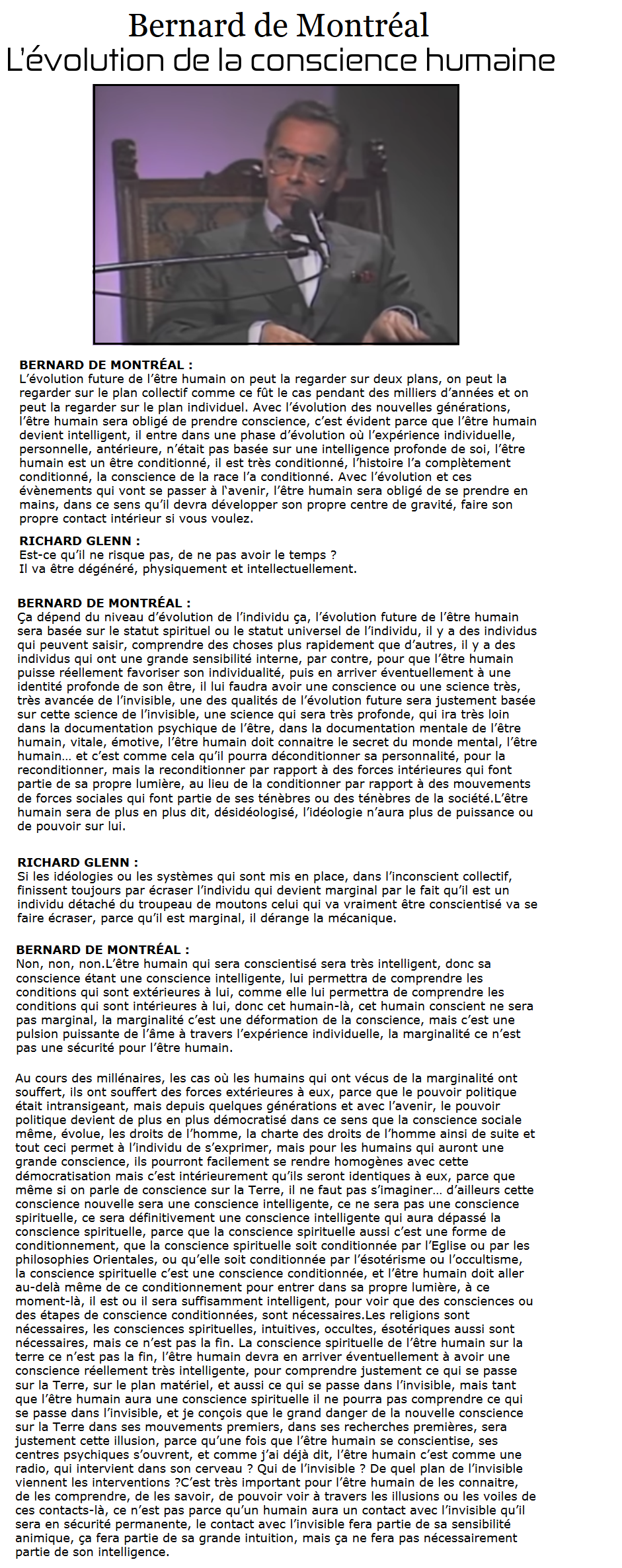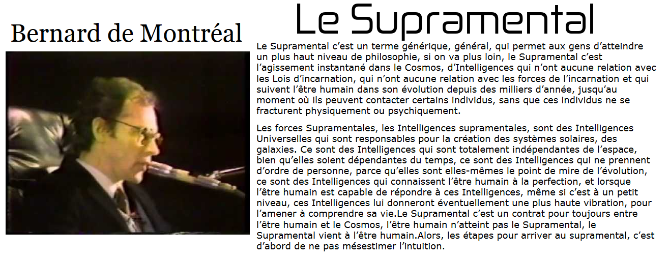 RICHARD GLENN :Ce soir on va essayer de descendre le voile, le masque on va essayer de le lever, qui est derrière le supramental ou alors qu’est-ce qui est derrière le supramental, et les extra-terrestres dans tout cela qui envoient des informations, des messages qui rejoignent la masse de la population qui a un cerveau capable de capter ces messages, on sait que ça se fait, les grands maîtres, du Collège Invisible agissent et communiquent les informations, il suffit d’être à l’écoute, mais à l’écoute parce qu’on est capable de l’être, ou bien être à l’écoute par hasard ? Il y a les gens qui par hasard apprennent des choses qui viennent d’ailleurs, et tout le monde autour de la Terre, en même temps, reçoit la même information et les informations changent de période en période au cours des années, comme on sait présentement que l’information majeure est de justement désillusionner les gens vis-à-vis de l’ésotérisme, et cela dure depuis au moins un mois, au mois d’août c’était surtout cela, de créer chez les gens la conscience qu’ils doivent d’abord être pratiques, être intellectuels, être rationnels et que tout ce qui s’appelait ésotérisme était peut-être un rêve, du rêve, et on verra plusieurs mouvements accentuer le pas dans ce sens-là.Alors Bernard est-ce que je peux vous poser la question : QUI EST DERRIÈRE LE SUPRAMENTAL ?