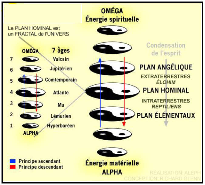 Dans ces mondes il existe des êtres dit ascendant (être de lumière) et des êtres dit descendant (être de ténèbres). Les premiers cherchent à retourner vers l'esprit alors que les second cherchent à descendre dans la matière.L'évolution suit une spirale qui relie chaque plan d'existence (non représenté sur le dessin). Comme on sait maintenant que tous est fractal dans l'univers. Chaque plan d'existence est à son tour une spirale que l'on peu subdivisé en un certain nombre de plan. Ainsi dans notre plan hominal nous sommes présentement au cinquième plan d'évolution. Ce qui signifie que cela fait cinq fois que le monde se construit puis se détruit. Nous avons quitté le monde des Atlantes (4ième plan) il y a environ 20000 ans et nous nous apprêtons très prochainement à entrer dans l'ère Jupitérien (6ième plan du plan hominal).