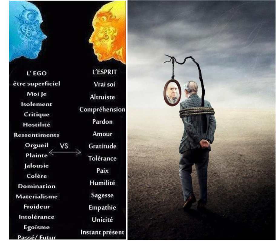 L’ego, d’un point de vue ésotérique, n’est en fait rien d’autre qu’une impression d’être un « je » séparé, un esprit individualisé.Parmi les différentes caracteristiques de l'ego,nous devons comprendre que celui-ci n'est pas quelque chose d'unique,bien au contraire.L'ego représente la somme de tous nos"MOI" ou "AGREGAT PSYCHOLOGIQUE".Il est comparable à des personnages incarnant en nous selon le moment,LA COLERE,LA JALOUSIE,L'IMPATIENCE,LA HAINE,LE MENSONGE,LA PEUR...Nous devons donc retenir que l'EGO EST PLURALITE.Selon Sartre, « l'ego n'est pas le propriétaire de la conscience, il en est l'objet.».l'ego est la représentation fausse qu'un individu se fait de lui-même. Cette représentation fait écran à la vraie nature de l'homme.