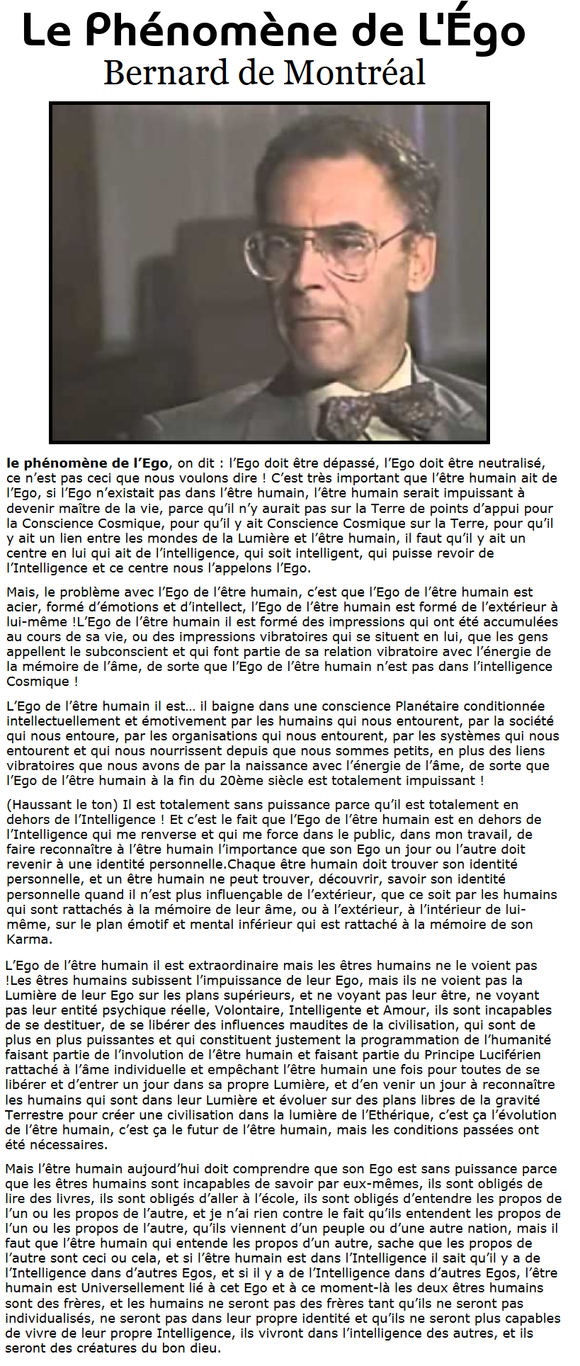 Alors, dans ce phénomène il y a deux parties : il y a l’Ego ou il n’y a pas d’Ego.L’Ego qui fait un mouvement, le fait toujours par réflection sur lui-même.L’Ego qui est en fusion avec le Supramental obéit à des Lois de vibrations qui sont des Lois créatives et qui permettent au Supramental de faire comprendre sur le plan matériel, sur le plan physique, les limitations de l’Ego.Aujourd’hui l’Ego de l’être humain à cause de ses émotions refuse le Supramental, l’être humain ne refuse pas le Supramental par plaisir ou par négation, mais il le refuse par le fait même de sa constitution matérielle, vibratoire, énergétique. Lorsque le Supramental, les Intelligences Créatives, entrent en contact avec un Ego humain, la première chose qu’ils font c’est de lui enlever les facultés naturelles qui se sont développées au cours des siècles et qui se sont transmises par le code génétique et aussi par le système de culturation, la faculté la plus importante qu’on lui enlève est la faculté de la mémoire subjective.