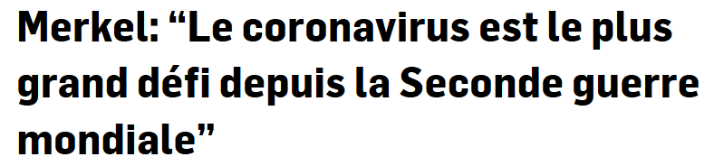 "Depuis la Réunification allemande, non, depuis la Seconde Guerre mondiale, il n'y a pas eu de défi pour notre pays qui dépende autant de notre solidarité commune", a déclaré la chancelière dans une adresse télévisée aux Allemands.Signe de l'importance symbolique de l'intervention, il s'agit pour la chancelière, peu friande des grandes envolées aux accents dramatiques, d'une première sous ce format depuis son arrivée au pouvoir en 2005.