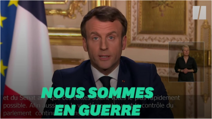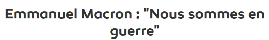 "Nous sommes en guerre sanitaire", a déclaré lundi soir à plusieurs reprises Emmanuel Macron dans une allocution télévisée consacrée à la lutte contre la pandémie de coronavirus."Nous sommes en guerre, en guerre sanitaire certes. Nous ne luttons ni contre une armée, ni contre une autre nation. Mais l'ennemi est là, invisible, insaisissable, qui progresse. Et cela requiert notre mobilisation générale", a déclaré le président français en appelant à "éviter l'esprit de panique" et à ne pas croire "les fausses rumeurs, les demi-experts ou les faux sachants". "Nous devons tous avoir l'esprit de responsabilité".