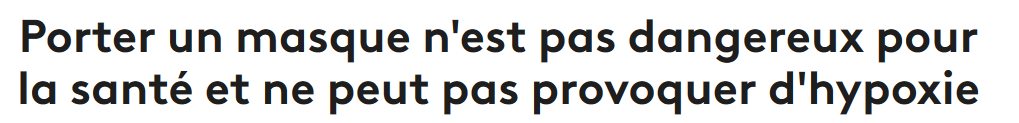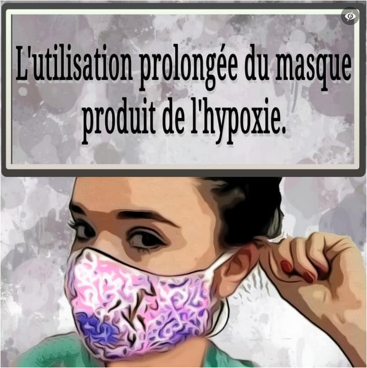 Attention, cette publication est fausse. Les professionnels de santé sont clairs : il n’y a aucun risque d’hypoxie ou de manque d’apport en oxygène lors du port du masque, même pendant plusieurs heures.les masques de protection utilisés contre le nouveau coronavirus permettent l’échange d’air et que le dioxyde de carbone ne s’accumule pas dans l’espace entre le masque facial et le visage.Il peut certes y avoir un inconfort ou une sensation d’essoufflement lors du port du masque, notamment lorsque l’on porte des lunettes, mais c’est sans dangerosité et conséquences médicales.Cette publication peut même s’avérer dangereuse puisqu’elle conseille d’enlever et remettre régulièrement son masque ce qui peut, de fait, rendre son utilisation inefficace.