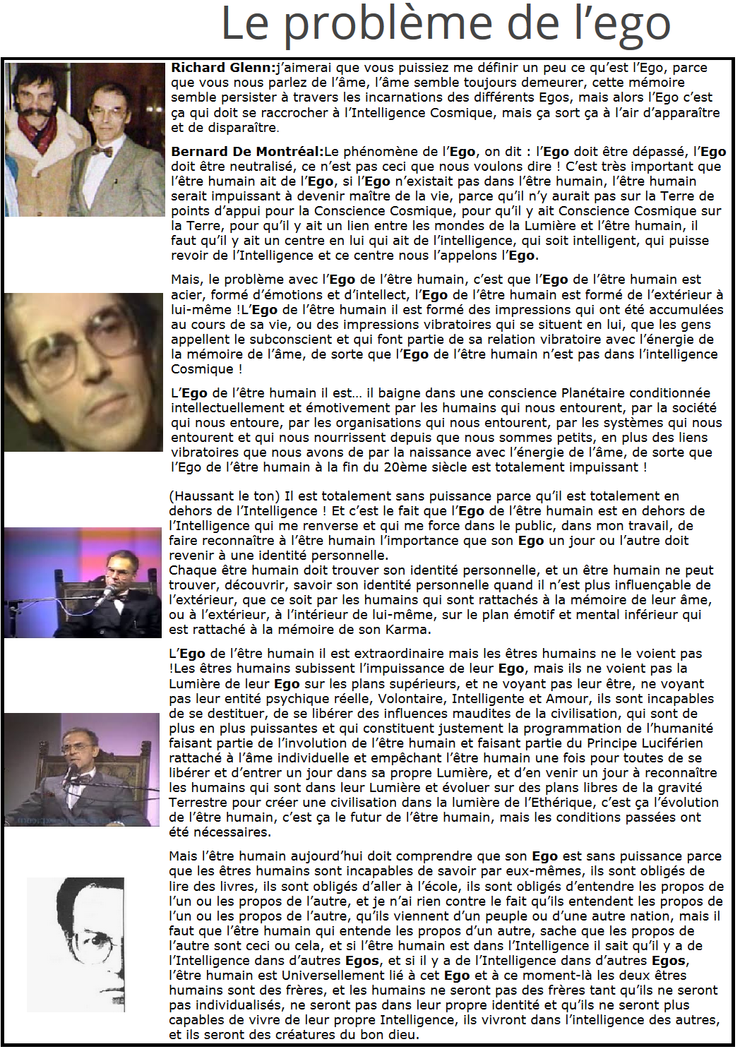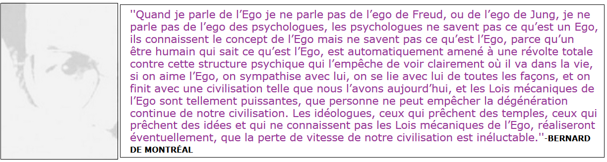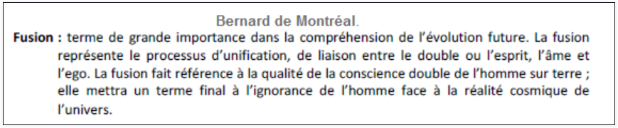 Bernard de Montréal qualifiera sa condition d’ «état de fusion » permanent et constant, relié à un « niveau mental d’où émane la pensée libre ». Il ne recouvrera jamais pleinement la mémoire, et accèdera à des niveaux d'information qui, disait-il, en viendraient à caractériser l'«homme nouveau»- Bernard de Montréal est un homme qui a vécu l’expérience particulière de “vivre la fusion entre sa conscience terrestre et sa conscience cosmique”.-C’est ce que les alchimistes pourraient entendre par la fixation du mercure dans le corps ou la réalisation de la pierre philosophale, ou encore ce que les chrétiens pourraient entendre par l’incarnation de l’Esprit Saint ou la quête du Saint Graal, ou encore d’autres par la science infuse ou la compréhension instantanée-Suite à cette expérience, il a décidé de témoigner de ce qu’il avait vécu et surtout d’expliquer ce que l’homme a besoin pour évoluer, se transmuter, et vivre à son tour l’expérience de la fusion.-La fusion c’est le développement éventuel de la rencontre entre l’énergie de l’esprit, l’énergie de l’âme et l’énergie de l’égo. L’axe. L’esprit: la lumière, l’âme, dépolluée, épurée, qui cesse d’être une mémoire personnelle, pour devenir une mémoire cosmique et l’égo, qui est la lentille permettant à cette énergie de descendre et de répondre sur le plan matériel à ses propres besoin créatif en même temps que sur le plan humain, elle permet de créer, au niveau de la science et ainsi de suite au cours de l’évolution. La formation de l’axe entre l’esprit, l’âme et l’égo est essentielle. Avec le temps nous détruirons la forme de l’esprit, nous emploierons un autre terme pour expliquer ce qu’est l’esprit parce que l’homme un jour doit en arriver à avoir une compréhension politique de l’invisible. Lorsque la forme de l’esprit sera détruite et qu’elle sera remplacée par une autre forme, se sera le début de la compréhension des mondes invisible, de leurs gouvernements, de leur gestion des humanités, de leur gestion des races, de leur gestion du savoir, de leur gestion des sciences. L’homme aura une compréhension intégrale de l’infinité.