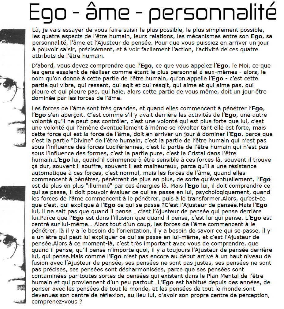 ÉGO - :Le terme Ego est un substantif tiré du pronom personnel latin ego («moi»). Dans l'homme, la conscience du « je suis moi », ou le sentiment d'identité. La philosophie ésotérique enseigne l'existence de deux Ego dans l'homme : l'ego mortel, ou personnel (qu'elle désigne comme « la personnalité ») et l'Ego supérieur, divin, ou impersonnel (qu'elle nomme « l'individualité »).L’égo, d’un point de vue ésotérique, n’est en fait rien d’autre qu’une impression d’être un « je » séparé, un esprit individualisé.Parmi les différentes caractéristiques de l'ego,nous devons comprendre que celui-ci n'est pas quelque chose d'unique,bien au contraire.L'ego représente la somme de tous nos"MOI" ou "AGREGAT PSYCHOLOGIQUE".Il est comparable à des personnages incarnant en nous selon le moment,LA COLERE,LA JALOUSIE,L'IMPATIENCE,LA HAINE,LE MENSONGE,LA PEUR...Nous devons donc retenir que l'EGO EST PLURALITÉ.