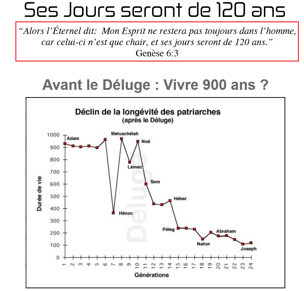 L’âge moyen des patriarches d’avant le Déluge (Gen 5), à l’exception d’Énoch (qui fut enlevé pour le protéger) et de Noé (dont la vie s’est poursuivit après le Déluge) était de 907,5 ans.