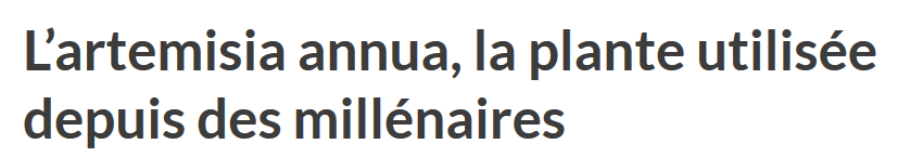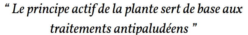 Il y a 2 000 ans la Chine découvre l’artemisa annua. Ses feuilles contiennent des principes actifs très intéressants. Ses inflorescences et sa tige sont aussi curatives, mais moins que les feuilles. Très vite, les Chinois l’utilisent en tisanes. Ils font tremper les feuilles dans de l’eau chaude durant toute une nuit et boivent le précieux breuvage le lendemain matin.Durant la guerre du Vietnam, les Américains étaient traités à base de chloroquine pour éviter d’attraper le paludisme. Les Vietnamiens, non protégés, redoutaient plus la maladie que les GI américains. Ils ont alors fait appel à la Chine pour les aider à lutter contre la maladie.