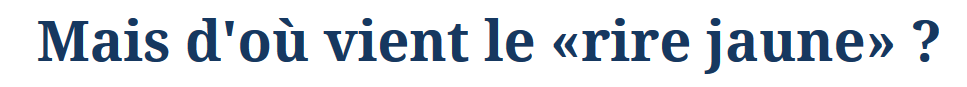 La formule demeure obscure et sujette à de nombreuses hypothèses.-«Elle est liée au safran, réputé provoquer une sorte de folie qui déclenche un rire incontrôlable», -«Il rit jaune comme farine.» La farine faisant non pas référence ici à l'aliment, mais aux «dissimulateurs» en langage argotique,L'expression «rire jaune» serait donc selon toute vraisemblance dérivée de ce jeu de mots pour qualifier celui qui a un rire hypocrite. Ou du moins, celui qui, en souriant, parvient à rouler son interlocuteur... dans la farine!-Le jaune, lorsqu’il est éclatant, est le symbole des dieux. A l’inverse, lorsqu’il est mat, il représente le soufre, donc l’enfer, mais aussi la perfidie. Cependant l’expression "rire jaune" provient surtout du fait que les hépatiques sont souvent de mauvaise humeur, et lorsqu’ils se forcent à rire, la bile teinte leur visage de cette couleur jaune pâle. Par extension, cette expression s’applique à toute personne qui semble se forcer à rire, qui tente de masquer sa colère ou qui ne veut pas montrer qu’elle est vexée.Beaucoup font aujourd'hui remonter l'expression aux Asiatiques. Et pourtant, si cette communauté a bien donné lieu a des formules nauséabondes telle le «péril jaune» aux États-Unis au XIXe siècle, il n'en est rien derrière celle de «rire jaune». Simple d'apparence, la locution trouve en réalité ses racines dans un herbage de symboliques bien buissonneux. La couleur jaune ayant tantôt été l'emblème de la vie tantôt celui de la mort. C'est ainsi que naquit durant l'ère médiévale tout une mythologie autour de la couleur jaune.