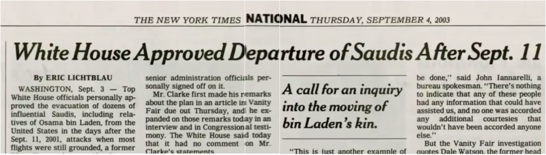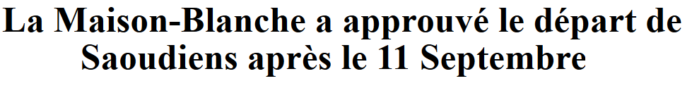 Des représentants de haut rang de la Maison-Blanche ont personnellement approuvé, dans les jours qui ont suivi les attaques du 11 septembre 2001, l’évacuation des États-Unis de dizaines de saoudiens influents, y compris des parents d’Oussama ben Laden, alors que la plupart des avions étaient cloués au sol.