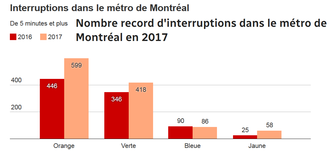 Selon des données obtenues par CBC grâce à la loi d'accès aux documents des organismes publics, il y a eu 1171 interruptions de plus de 5 minutes en 2017, une augmentation de 25 % par rapport à l'année précédente. Ces chiffres, toutefois, ne tiennent pas compte des interruptions moins longues, puisque la STM n'en garde pas la trace.La durée moyenne de ces interruptions était de 11 minutes et 25 secondes.Avec ses 31 stations, c'est la ligne orange qui a le plus souvent écopé.