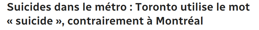 Dans beaucoup de grandes villes comme Montréal, Paris et New York, les autorités n'utilisent pas le mot « suicide » dans leurs communications lorsque quelqu'un s'enlève la vie dans le métro, causant une interruption de service. Toronto a choisi, au contraire, d'en parler ouvertement, ce qui est la « meilleure » stratégie, selon une experte.La Société de transport de Montréal n'emploie pas le mot « suicide », parlant plutôt d'une « intervention des services d'urgence », pour "ne pas inciter d'autres personnes à commettre ces actes malheureux".La STM recense une vingtaine de tentatives de suicide chaque année dans le métro.Même son de cloche de la part de la MTA à New York et de la RATP à Paris, qui ajoute que seule la police y a le pouvoir de confirmer qu'il s'agit d'un suicide.À Toronto, la Commission de transport utilise souvent l'expression « blessé au niveau des rails » dans ses alertes automatisées dans les médias sociaux et sur les écrans dans le métro.Mais lorsque le tweet vient du porte-parole de la CTT Brad Ross, ce dernier, qui a plus de 30 000 abonnés sur Twitter, fait directement référence au suicide, en ajoutant le "contexte" nécessaire, explique-t-il.