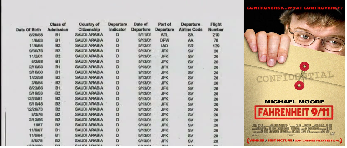 Le film établit également une part des liens qui existent entre la famille Bush et la famille ben Laden, et comment l'administration américaine a facilité le départ de membres de cette famille après les attentats du 11 septembre 2001.