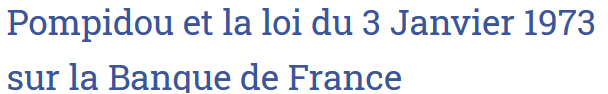 Cette loi (73-7) du 3 janvier 1973(Date du vote de la loi : 3 Janvier, sur- lendemain du jour de l'an, quand tout le monde est occupé On trouve beaucoup de lois " scélérates" passées le 23 ou 26 décembre ou le 2 ou 3 Janvier) a été abrogée en 1993, elle n'interdisait pas au Trésor français de se financer (sans intérêts) auprès de la Banque de France mais s'inscrit néanmoins dans un processus de dépossession par l'Etat de son droit de battre monnaie en faveur des banques commerciales -