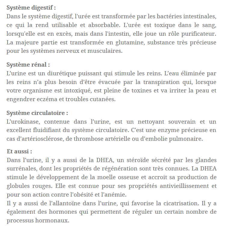 L’amaroli est le nom donné en Inde à la pratique qui consiste à boire une partie de son urine pour entretenir sa santé ou se soigner. En Occident, elle est appelée urinothérapie, ou auto-urine thérapie.L'usage religieux de l'urinothérapie est documenté dans un texte sanskrit daté de 5000 ans, le Damar Tantra dans lequel la pratique s'appelle « Shivambu Kalpa »qui regroupe plus de cent vers consacrées à cette boisson exceptionnelle.Shiva explique à sa femme comment, en buvant ce nectar tous les jours, on finit par se guérir de tous les maux et l’on peut atteindre l’éveil spirituel- Le papyrus Ebers, l'un des plus anciens traités médicaux qui nous soit parvenu et qui aurait été rédigé au XVIe siècle avant notre ère, propose 55 recettes à base d'urine.En Allemagne8, l'amaroli aurait séduit cinq millions de personnes, deux millions au Japon et un million aux Pays-Bas. Des congrès mondiaux réunissant notamment des médecins ont été consacrés à l'amaroli en Europe à la fin du XXe siècle. Selon la littérature de ses partisans sur le sujet, l'amaroli aurait des propriétés curatives étonnantes (augmentation des processus naturels d'élimination), mais beaucoup l'utilisent aussi à titre préventif, et comme cosmétique.Le Dr. Beatrice Bartnett dévoile dans son étude « Urine Therapy - It May Save Your Life » que nous avons bu de l’urine tout au long de la gestation, parce que l’urine est le fluide principal du fluide amniotique. Ce liquide amniotique dans lequel nage le bébé avant sa naissance, est principalement constitué d’urée qui vient de l’urine du fœtus lui-même. Cela assure la croissance et la protection du bébé, ainsi qu’une bonne cicatrisation de toute plaie à l’intérieur de l’utérus.L’urine est un produit secondaire stérile, qui résulte du filtrage du sang. Les anciens ne s’y trompaient pas. Ambroise Paré, père de la chirurgie moderne, recommandait l’urine pour désinfecter et cicatriser les plaies. Au temps de Pasteur, l’urine de jument entrait dans la composition de sérums et de vaccins. Ne vous a-t-on jamais dit qu’il faut faire pipi sur une piqûre de méduse ou d’abeille? Votre grand-mère ne vous a-t-elle jamais dit qu’on pouvait se faire des compresses d’urine sur les plaques d’eczéma, de psoriasis ou sur les plaies ? Nombreuses aussi sont les histoires de soldats perdus dans le désert, de marins blessés en mer ou d’alpinistes partis à la conquête des sommets qui ont bu leur urine pour survivre. L’urine était aussi utilisée autrefois en usage externe pour faire briller les cheveux et blanchir les dents.La liste des substances contenues dans l’urine est longue, comme vous avez pu vous en rendre compte. L'urine agit par ses substances vivantes : enzymes, hormones, neurotransmetteurs, vitamines, anticorps, antibiotiques et autres médicaments naturels, par un processus d'auto-vaccination et de transmutations biologiques. Elle a des effets nettoyants et régénérateurs.
