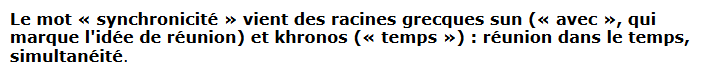 Les synchronicités sont autant de moments qui nous interpellent et résonnent en nous à un moment précis. Penser fort à quelqu’un et recevoir son appel téléphonique, écrire un mot au moment même où quelqu'un le prononce, se rappeler d’une vieille chanson et l'entendre quelques minutes après à la radio...-Le psychiatre Carl Gustav Jung définit la synchronicité comme étant une occurrence simultanée de deux ou plusieurs évènements qui n'ont pas de relation causale entre eux, mais qui ont un sens pour la personne qui les vit. Selon la psychologie jungienne, on peut y associer la notion d’inconscient collectif, bagage commun imaginaire dont sont pourvus les êtres humains, constitué de différents archétypes sortes de “forme pensée” comparables aux champs morphiques de Rupert Sheldrake.
