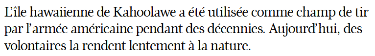 En 1993, les militaires ont rendu Kahoolawe à l’Etat d’Hawaii. La KIRC a été créée peu après et, grâce à 400 millions de crédits fédéraux, la marine a fait appel à des entreprises civiles pour nettoyer en surface 8 000 hectares de l’île, sur une superficie totale de 11 000 hectares. Elles ont débarrassé quelque 4 000 tonnes de ferraille et 11 000 pneus. Ce fut le plus important assainissement jamais entrepris par la marine américaine – et la plus grosse opération héliportée de son histoire. Pour elle, le problème était réglé. Mais pour la KIRC et le PKO, le travail de régénération ne faisait que commencer. “Pour le moment, il existe deux zones dans l’île : la zone 1 a été nettoyée, en surface seulement, par l’armée ; dans la zone 2, le nettoyage a été effectué jusqu’à plus d’un mètre de profondeur avec des foreuses à essence”...