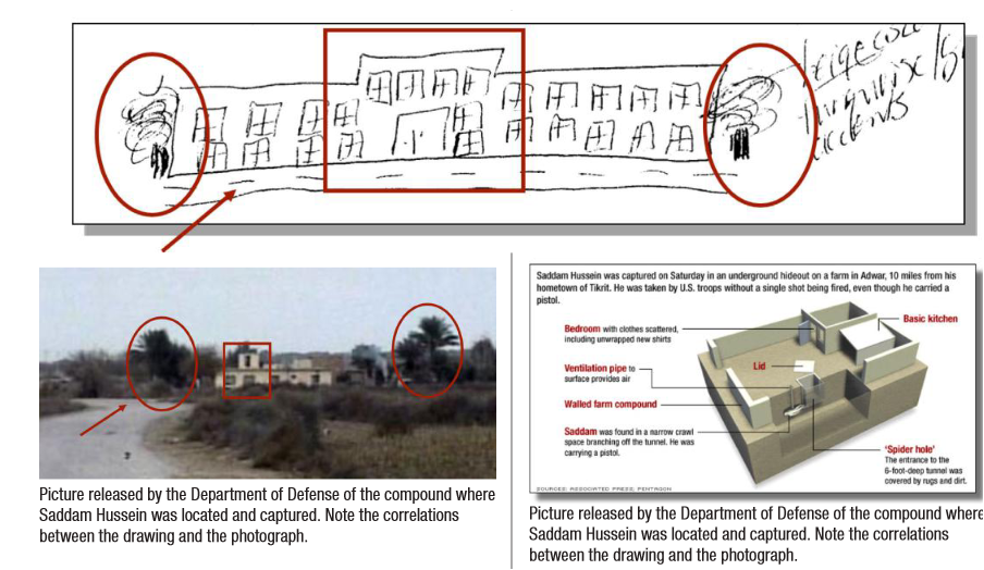 En novembre 2003, le chercheur Stephan A. Schwartz anime un séminaire de remote viewing avec quelques dizaines d’étudiants à l’Atlantic University, en Virginie. Le deuxième jour, il leur soumet l’exercice suivant : « Décrire la localisation de Saddam Hussein lorsqu’il sera découvert et capturé par les forces de la coalition ». Les documents sont photocopiés et les originaux placés dans un coffre. Ensuite, toutes les données sont analysées à l’aide des techniques utilisées par la police pour reconstituer un événement à partir de plusieurs témoignages. Elles consistent notamment à retenir les éléments récurrents dans les données, ce qui fait « consensus », ainsi que les éléments qui semblent peu probables. La synthèse de l’analyse est formulée ainsi: «Saddam sera dans un souterrain ou une cave, que l’on atteint par un tunnel. Il sera derrière une maison ordinaire dans les abords d’un petit village à côté de Tikrit. La maison fera partie d’un petit complexe bordé d’un côté par une route et de l’autre par une rivière proche. Il y aura: de la végétation, notamment un grand palmier. Hussein ressemblera à une personne sans abri, avec des vêtements sales et abîmés, et une barbe grise aura seulement deux ou trois partisans avec lui au moment de sa découvert, ainsi qu’une arme et beaucoup d’argent. Il sera provocant, mais il ne résistera pas et sera découragé ».